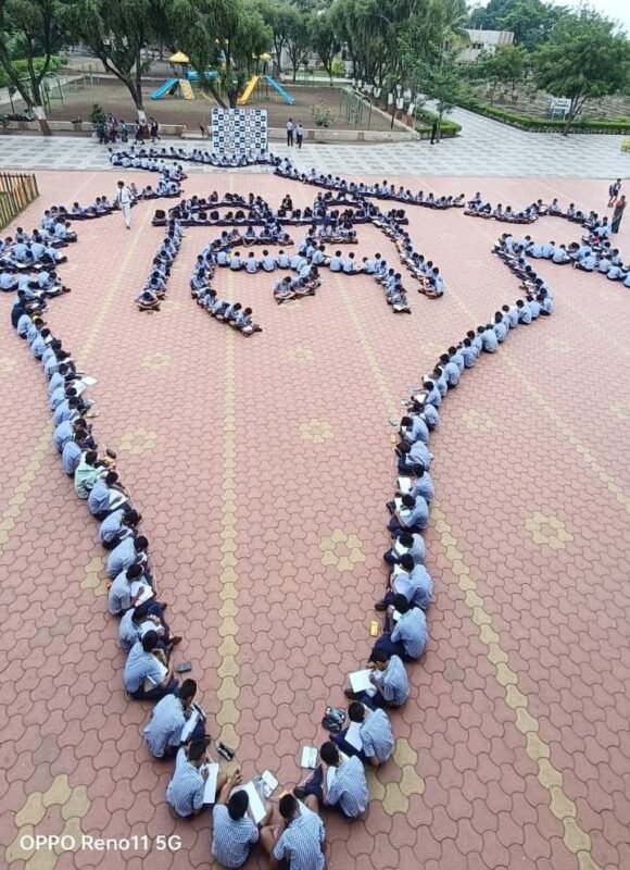 यावेळी हिंदी दिनानिमित आयोजित करण्यात आलेल्या निबंध स्पर्धेची बैठक व्यवस्था शाळेच्या भव्य प्रांगणात आपल्या भारत देशाच्या नकाशाची भव्य प्रतिकृती व हिंदी नामफलक साकारत करण्यात आली होती.